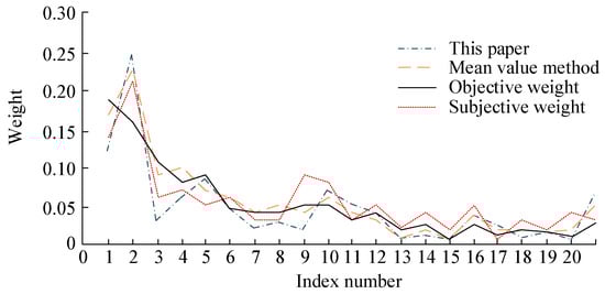 To evaluate the performance of the evaluation model proposed in this experiment, the subjective weight, objective weight, mean method, and weight value changes of the method proposed in this experiment were compared. As seen in Figure 3, there was a significant difference in weight changes between the subjective weight method and objective weight method. If either method is used separately, there may be subjective arbitrariness, or the calculation results of objective data may not match the actual situation. Therefore, this study adopted a subjective and objective integrated weight optimization algorithm for weight calculation.