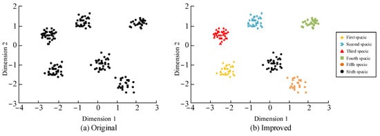 To verify the effectiveness of the fuzzy clustering method proposed in this experiment, simulation analysis was conducted in Matlab to determine the execution efficiency of the improved fuzzy clustering method. Six sets of data points with a sample size of 120 were randomly generated in Matlab software. Figure 4a shows the distribution of generated data. Then, an improved fuzzy clustering method was used to analyze these data, and Figure 4b shows the results. By comparing Figure 4a,b, which categories each data point belongs to can be accurately seen. Moreover, the data distribution of the clustering results is tight and without crossover, achieving a clustering accuracy of 100%. This indicates that the improved fuzzy clustering method has good clustering performance.