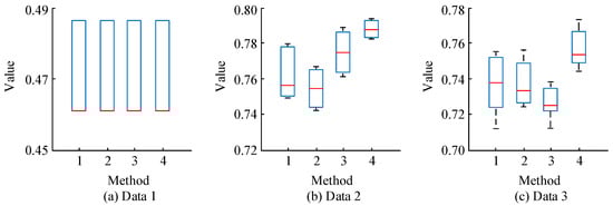 Box graphs can be used for comparing the performance of clustering methods. If the box position is higher and its size is smaller, the algorithm performance is better. In Figure 5, method 1 is FCM [35], method 2 is KFCM [36], method 3 is IFCM [37], and method 4 is the improved fuzzy clustering method proposed in this experiment. KFCM is an improved fuzzy c-means clustering algorithm based on kernel. It maps points in the original space to the feature space through a kernel function. Considering that the points in the original space cannot be divided by a linear function, they are transformed into a higher dimensional space. KFCM can find a linear function in this high-dimensional space, which is easy to partition the original data. The IFCM algorithm introduces intuitive fuzzy membership on the basis of the FCM algorithm. Fuzzy clustering defined by an intuitionistic fuzzy set can converge to a more ideal cluster center. From Figure 5, the results for four methods in dataset 1 are consistent. In datasets 2 and 3, the optimization algorithm in this experiment is significantly superior to other algorithms.