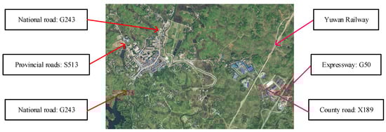 In Figure 7, G243 runs through Yuntai Town. It connects Haitang Town to the north and directly leads to Dianjiang County, and connects Shiyan Town and Gelan Town to the south and directly leads to Changshou District. S513 connects the Wuhua Mountain Scenic Area to the west and turns toward Changshou District. Chongqing Wanzhou Railway passes through the industrial zone of Yuntai Town and is the main artery for bulk commodity trading in Yuntai Town. G50 passes north through Haitang Town and Chenxi Town and directly leads to Dianjiang County. Additionally, it passes south through Changshou District and directly leads to Chongqing City. X189 connects Yantai Town and Baojia Town.
