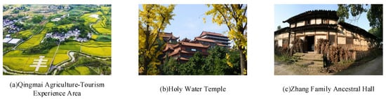 For characteristic industries, as early as the 1990s, Yuntai Town actively carried out the fruit cooperative project and became an important fruit production base in Changshou District. In recent years, Yuntai Town has been committed to creating ecological agriculture and constructing comprehensive projects represented by Qingmai Agriculture Tourism Experience Area. The main tourism resources and characteristic industries are shown in Figure 9.