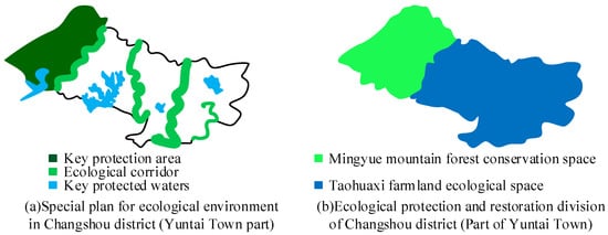 According to Figure 10a, the ecological environment protection focus in Yuntai Town is on the western mountainous area, central hilly area, eastern Longxi River mainstream area, and main reservoirs. According to Figure 10b, ecological protection and restoration zones in Yuntai Town mainly include forest conservation space and farmland ecological space. It can confirm the two indicators in Table 1 that Yuntai Town did not meet the regional standard values. These two indicators are soil erosion control and qualified rate of pesticide residues in major crops. Based on the overall planning of Changshou District and the actual situation of Yuntai Town, ecological environment functional zones of Yuntai Town are divided into ecological environment functional zones and ecological economy functional zones.