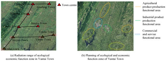 Yuntai Town is adjacent to Changshou District and Dianjiang County. On the one hand, it bears the urban pressure from urban leakage. On the other hand, it also bears the rural pressure generated during the transfer of vast rural areas in Northeast Chongqing to the main urban area of Chongqing. For Yuntai Town, its main agricultural products, industrial products, and service-oriented goods not only need to be used by residents in the built-up area and rural areas within the jurisdiction, but also to meet the needs of some outside the jurisdiction. The planning of the ecological and economic functional zones in Yuntai Town is shown in Figure 12.