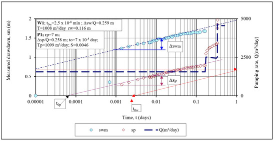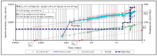 Graphical representation of the results of analysis of the measured drawdown (cm) of the water level in the pumped well W1 and piezometer P-1 during the first step of the step-drawdown test [10].