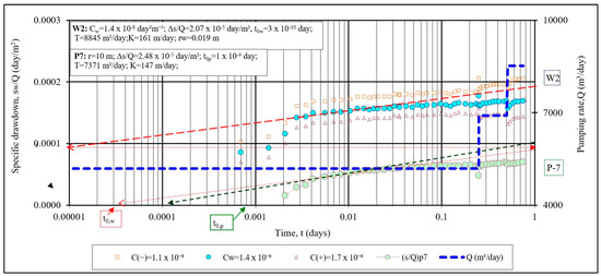 When identifying the parameters, the corrected drawdown data (Equation (9)) were used. The identification procedure and the results of the parameters achieved by transient state methods are shown in Figure 6. The aquifer transmissivity coefficient calculated from the graphical presentation of the transient flow, in Figure 6, was verified by analyzing the sequence of quasi-steady positions of specific drawdown between well W2 and piezometer P7, expressed by Equations (8) and (14) (Figure 7). The same figure shows the hydraulic conductivity results (Equations (12) and (15)), of which is close to the conductivity of the pumped well W2 in Figure 6, and the hydraulic conductivity of the initial aquifer is similar to the conductivity result determined for P-1 by the transient method for P7 (Figure 7).
