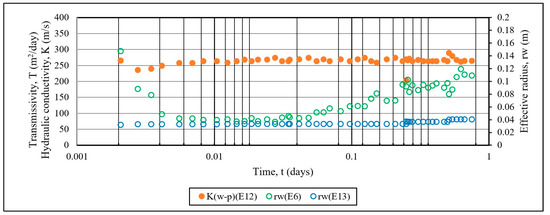 Calculations of the effective radius of the well W1 are shown in Figure 4. Using the respective equations, Figure 5 shows the transmissivity of the aquifer by following a series of quasi-steady positions during pumping test of the well. The operational data file of the specific drawdown of the linear losses of the well, (Equation (2)), and the observation piezometer for simultaneous measurements, offer a reliable presentation of the sequence of quasi-steady positions during the pumping test of the well W1 for calculating the transmissivity of the aquifer (Equation (8), Figure 4) and the effective radius of the well (Equation (7), Figure 4). When calculating with these equations of steady flow, calculations of their values are available with equations for transient flow in which the effects of well losses are excluded.