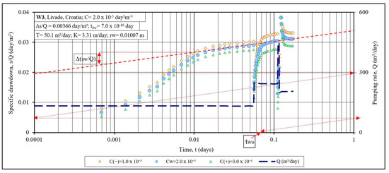 Well W1, in Ravnik (Table 1, Figure 2), captures a sandy, confined aquifer. The step-drawdown test was carried out in three steps (Figure 2) for a total of 12 h, and the first step lasted 6 h. The interpretation of the step-test is presented as a general case of identifying the parameters of a closed aquifer by applying the specific drawdown function, . From the archived recordings of the water level during the testing, the drawdown data were selected with the frequency at which the moments of measurement and the continuity of the development of the specific drawdown in the bi-log scale were visible (Figure 2). For the measured drawdowns, , in the selected measurement times, the pumping rate of the well was estimated and a list was formed, suitable for the graphic presentation of the operational data file and the specific drawdown of linear losses (Equation (2)). Curves of linear losses were plotted for three values: underestimated (), real () and overestimated () coefficients of nonlinear losses. In the first step of the step-drawdown test, the data on the semi-log diagram already formed a linear sequence (Figure 2) equivalent to the Cooper–Jacob diagram of the development of drawdown as a function of time, but with a different meaning. The diagram is independent of the pumping rate of the well and represents a real function of the properties of the affected aquifer. Gradual slight changes in the pumping rate spontaneously changed the drawdown maintaining the specific drawdown only as a function of aquifer properties. A more significant rapid change in the yield of the well caused a deformation of the curve caused by the inertia of the aquifer system when moving from the direction , formed during the previous pumping step, to its extension with the same ratio at the next step of the step-test (Figure 2), but with different values of and relative to the appropriate effect of the properties of the aquifer. Thus, the shape of the line before and after the induced discontinuity in the curve identically expresses the transmissivity of the aquifer. Such curve shaping is a graphical difference in relation to Cooper and Jacob’s graphical method.