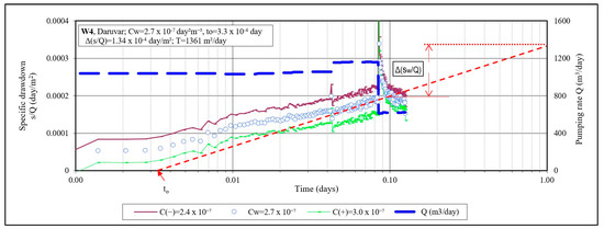 The continuous testing of well W4 in steps lasted 180 min (0.257 day, Figure 8). The maximum pumping rate was 13.45 L/s, and the highest drawdown of the water level was 0.59 m. The technical circumstances at the pumping station made it difficult to conduct the standard step test with an increasing pumping rate. Nevertheless, by frequent measurements of the pumping rate of the well and the resulting drawdown of the water level in it, a realistic picture of the development of the specific drawdown was identified for the reliable identification of the coefficient of nonlinear losses and the transmissivity of the investigated aquifer (Figure 8).