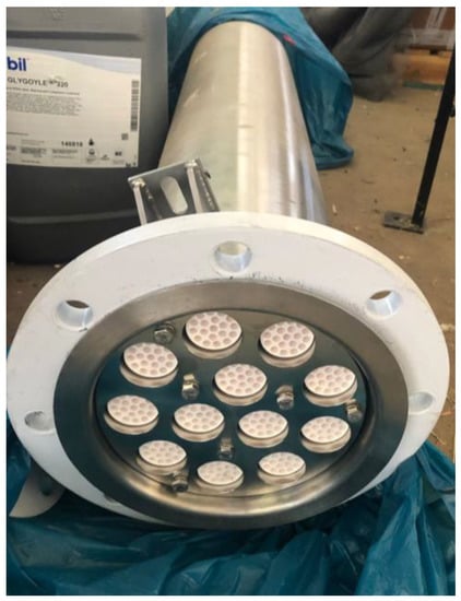 The process of wastewater filtration through the membranes, which allows the retention of solids that are larger than the diameter of the membrane’s pores, is called Tangential Flow Filtration (TFF). TFF is a filtration method in which the feed flow runs tangentially to the surface in the channels of the tubular membranes, so that retained particles and larger molecules do not accumulate on the membrane surface. In this way, no layer of the filtered particles remains on the membranes [32]. The MF unit has an inlet for the wastewater and outlets for the retentate and permeate (filtrate) effluents. A high overflow rate (OVR) of 2–4 m/s, which is a measure of the velocity of the fluid inside the channels, allows for more effective removal of the retained particles due to turbulent flow and the concomitant large buoyancy forces. However, large OVR in combination with the existence of particles may lead to attrition of the thin microfiltration layer. For that reason, we worked with a total feed flow of 2–3 m3/h, which gave a medium OVR of 0.13 m/s, and we applied frequent backpulsing (every 5 min) to remove the small cover layer that was formed. With the prerequisite that we do not have irreversible pore blocking, the momentary application of backflow, where the direction of solution’s flow is reversed, is sufficient to restore the membrane’s permeability. In this particular pilot system, backflow is applied with automatic timing, with the aim of preserving the membranes’ good functioning and balancing their internal pressure.