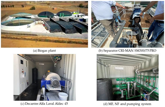 Photographs of (a) biogas plant; (b) mechanical separator; (c) centrifugal separator; and (d) microfiltration and nanofiltration units.