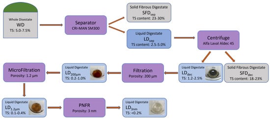 From D2 the WD can be separated using a mechanical separator CRI–MAN, SM300/75 Pro (CRI–MAN S.p.A., Correggio, Italy) in primary solid and liquid fractions. Then it was further separated with a centrifugal separator Alfa Laval Aldec 45 (Alfa Laval AB, Lund, Sweden) in secondary solid and liquid fractions. With the help of a pumping system consisting of three progressive cavity pumps from Roto Pump Ltd. Noida, India (models: RMC 542 ×2 and RLCB 571 ×1) and a direct drive plunger pump (Model: 2SF05SEEL from CAT PUMPS, Minneapolis, MN, USA), the fluid was led to all filtration units and intermediate tanks. Filtration units were acquired from Pentek, Coraopolis, PA, USA (bag filter), and microfiltration (MF) and nanofiltration (NF) units were acquired from Atech Innovations GmbH, (Gladbeck, Germany).