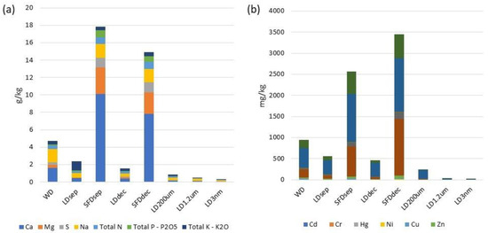 General observations derived from Table 2, Table 3 and Table 4 and Figure 4 revealed that the solid digestate exhibits a higher abundance of nutrients, minerals, and macronutrients in comparison to all liquid digestates, indicating the efficacy of the processes of mechanical separation and centrifugation. It is also worth mentioning that the type of separation affected the accumulation of macromolecules and metals or micronutrients. In particular, the mechanical separation is less capable of removing total K and NO3− as they appeared higher in content in LDsep 1.04 g/kg and 9.81 mg/kg compared to SFDsep 0.43 g/kg and 7.82 mg/kg, respectively. These findings are in agreement with those of a study by Popovic et al., who found that the separation efficiency can be enhanced by the addition of flocculants [33]. In the case of macronutrients Ca, Mg, S, and total N, mechanical separation with sieves (SFDsep) was more effective for their transfer to the solid digestate in contrast to centrifugal separation (SFDdec), which showed a better efficacy for Na, total P, and total K. Concerning trace elements and heavy metals, Hg, Cu, and B were better transferred to solid digestate using mechanical separation contrary to centrifugation, but the application of chitosan could increase centrifugation efficiency according to the results of Popovic et al. [33]. In the case of Cd, Cr, Ni, Zn, As, Fe, Mn, Si, and Al, a reverse phenomenon was observed as they were more efficiently transferred to solid digestate using centrifugation. It is observed that micronutrients can be adeptly transferred to the SFDdec, which could be further applied as a solid organic soil improver.