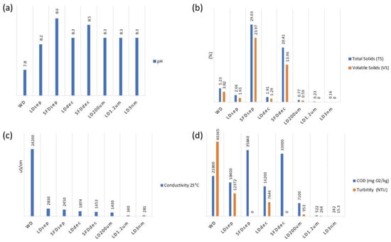 The pH values remain consistent across all treatment processes, averaging at 8.3, indicating a stable pH level throughout all filtration and separation procedures (Figure 5). The conductivity values exhibit a significant decrease as the treatment processes progress from LDdec = 1874 µS/cm to LDNF = 281 µS/cm. This suggests the effective reduction of influent conductivity by the treatment processes. The percentage of TS gradually decreases from LDdec = 1.91% to LDNF = 0.16%, indicating successful removal of solid particles during the treatment processes. The VS percentage remains consistently low and falls below the detectable limit (<0.05%), indicating efficient removal of volatile solids during the treatment processes. COD values exhibit a decreasing trend from LDdec = 16,200 mg O2/kg to LDNF = 242 mg O2/kg 8 min, demonstrating the effectiveness of the treatment processes in reducing organic pollutants. Turbidity values decrease as the treatment processes advance, indicating the removal of suspended particles and improved water clarity. Notably, TSS values demonstrate a significant decrease from LDdec = 6133 mg/kg to LDNF = 5.50 mg/kg, indicating effective removal of suspended solids during the treatment processes. Similarly, the VSS values remain consistently low and fall below the detectable limit. Salmonella spp., Escherichia coli, and Enterococcus faecalis show values below the detection limit (<9.1 or N.D.), indicating successful microbial removal during the process.