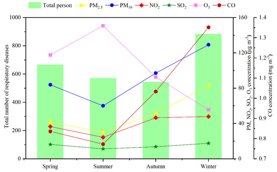 The correlation between the total number of respiratory diseases and the seasons was also investigated, revealing a distinct seasonal pattern, as depicted in Figure 2. The highest incidence occurred specifically during winter, with 884 cases, while the lowest incidence was observed in autumn, with 545 cases. The five conventional air pollutants (PM2.5, PM10, NO2, CO, and SO2) exhibited similar seasonal patterns, with the highest concentrations occurring in winter and the lowest in summer. In addition, the average concentrations of air pollutants (PM2.5, PM10, NO2, CO, and SO2) during winter significantly exceeded those of the annual average concentrations. Xinxiang is a city located in Northern China and relies on winter heating during cold months (from November 15 and March 15). The elevated concentrations of the PM2.5, PM10, NO2, and SO2 pollutants in winter were primarily due to winter heating, especially the combustion of coal for heating purposes. Previous studies have found that the winter heating policy leads to higher pollution concentrations in Northern China [21,30,31]. Additionally, Zhou et al. reported that during winter in China, there is a statistically significant association between air pollution and respiratory mortality in northern cities; however, such an association is not observed in southern cities of China [8]. From a seasonal perspective, respiratory diseases share similar seasonal patterns with the PM2.5, PM10, NO2, SO2, and CO pollutants. This suggests that the reason for the increase in the incidence of respiratory diseases in winter is associated with elevated concentrations of air pollutants.