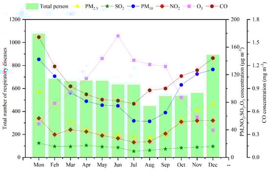 Figure 3 illustrates the monthly variations in the six conventional air pollutants and respiratory diseases. As depicted in Figure 3, August had the lowest number of respiratory disease cases, which corresponded to the lowest concentrations of PM10 and PM2.5. This suggests a significant reduction in particulate-matter-induced illnesses during this month. Conversely, January saw the highest number of cases, at 1077, indicating severe air pollution in Xinxiang City, with high levels of PM2.5. This also indicates a rise in air pollutant emissions resulting from increased human activities, such as coal burning, during the winter in January, leading to an increase in respiratory diseases related to pollution [32].