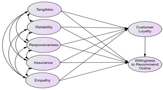 Customer loyalty has a mediating effect on the relationship between the service quality of food and beverage (empathy, assurance, responsiveness, reliability, and tangibles) and willingness to recommend online.
