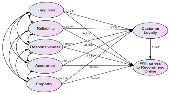 The verification of Hypothesis 1 showed reliability and responsiveness among sub-factors of service quality of food and beverage had a positive effect on customer loyalty. The verification of Hypothesis 2 showed that empathy among sub-factors of service quality of food and beverage had a positive effect on willingness to recommend online. The verification of Hypothesis 3 showed that customer loyalty had a positive effect on willingness to recommend online. The verification results of Hypotheses 1–3 are presented in Table 7.