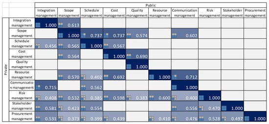 Next, we explored the relationship between the perceived importance of individual knowledge areas in the public and private sectors using rank correlation (Table 12). In the public sector, there was a significant relationship (cor. coef. = 0.613; sig. = 0.026) between integration management and scope management. Scope management also correlated with time management (cor. coef. = 0.737; sig. = 0.004), cost management (cor. coef. = 0.737; sig. = 0.004), quality management (cor. coef. = 0.574; sig. = 0.040), and communication management (cor. coef. = 0.602; sig. = 0.029). There was a significant relationship (cor. coef. = 0.567; sig. = 0.043) between time management and cost management. The degree of similarity (cor. coef. = 0.690; sig. = 0.009) was also significant between cost management and quality management. Finally, there was also a relatively high correlation (cor. coef. = 0.712; sig. = 0.006) between resource management and communication management.