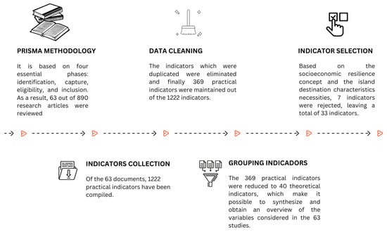 This work was conducted in three stages. The first stage consisted of designing and selecting indicators, which was conducted through a systematic literature review using the search terms resilience, risks, and disasters considering the databases of Scopus and Web OF Science databases (See Figure 1). The PRISMA method (2020) was used for the systematization, which is based on four essential phases: identification, capture, eligibility, and inclusion. As a result, 63 out of 890 research articles were reviewed, from which 1222 practical indicators were collected and homogenized into 40 theoretical indicators (See Figure 1). However, thirty-three indicators were selected based on the inherent factors of socioeconomic resilience to cope with a pandemic event in context of island tourist destination (See Table 1), and seven indicators were eliminated (household character, community services, land use diversity, climate, sturdier housing type, shelter capacity, location) since they did not meet the objective of this study or were similar in terms of expected results to other indicators in the matrix. Moreover, the matrix was divided into three dimensions: political structure (human and political resources), social structure (natural and social resources), economic structure (economic and physical resources) in order to understand the mechanism of marginalization that lead to vulnerability [], as shown in Table 1 and Appendix A.