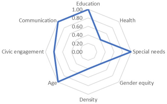 In addition, the population’s promiscuity has worsening impacts, such as the rapid spread of the virus, the lack of personal space, mental health, and the distribution of resources. In this way, it is considered for the category of social resources that the three axes, gender equity, density, and health, should be reinforced. In the same way, about the natural resource category in Figure 3, we observed negative trends in land use and food security for the island.