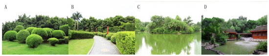 The landscape can be divided into 7 categories according to the different constituent of elements, as shown in Table 2. Since some types of landscape are very uncommon in real views, according to the different combinations of landscape elements included in the actual photos, the visual landscape of green space in an urban park is divided into four categories: green landscape, blue and green landscape, green and gray landscape, and blue, green, and gray landscape. Among the 120 images obtained from the survey, four of each type of landscape photos were selected according to the principle of randomization, and all of them were divided into four groups. Each group contains four types of landscape photos, which were used as the picture materials for the pre-experiment (show as Table 3). The A–D landscapes shown in Figure 1 were used as the picture materials for the formal experiment (Figure 2).