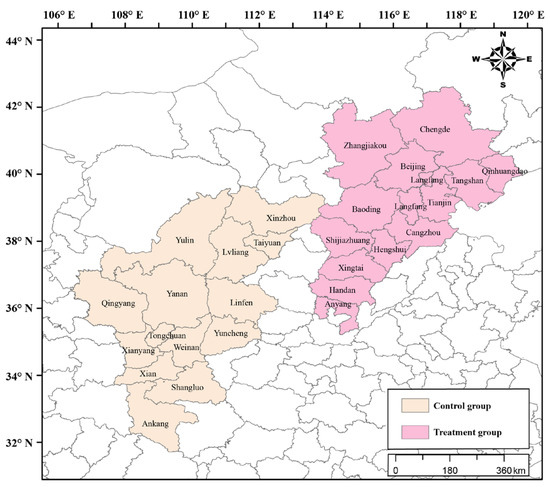 Since both air quality pollution and treatment effects have unavoidable spillover [37], this study considered the 14 cities in the Beijing–Tianjin–Hebei region (Beijing, Zhangjiakou, Tianjin, Baoding, Chengde, Anyang, Cangzhou, Handan, Hengshui, Langfang, Qinhuangdao, Shijiazhuang, Xingtai, and Tangshan) as the treated group. These cities were expected to be affected by large-scale pollution or air quality improvements resulting from the treatment measures. Regarding the selection of the control group, since air quality is again similar between spatially adjacent cities [38], cities with the same climate as the cities in the treated group were selected as the control group. Precisely, the control group consisted of Taiyuan, Lvliang, Xinzhou, Linfen, and Yuncheng in Shanxi Province, Yulin, Xi’an, Yan’an, Weinan, Shangluo, Tongchuan, Ankang, and Xianyang in Shaanxi Province, and Qingyang in the Ningxia Hui Autonomous Region. Figure 1 shows the location of these cities.