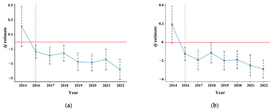 The results of the parallel trend test for Ln(AQI) and Ln(PM2.5). (a) The parallel trend test for Ln(AQI); (b) the parallel trend test for Ln(PM2.5). The figure was produced by Stata/MP 17.0 [57].