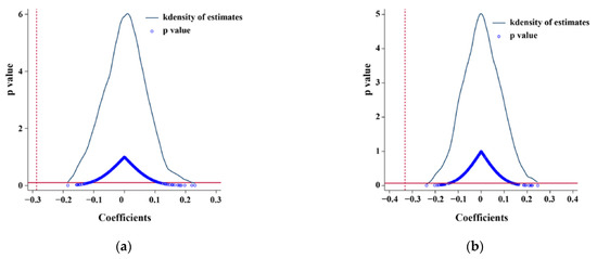 The results of the placebo test for Ln(AQI) and Ln(PM2.5). (a) Placebo test for Ln (AQI); (b) placebo test for Ln (PM2.5). The figure was produced by Stata/MP 17.0 [57].