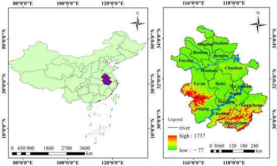 Located in the central region of China’s Yangtze River Delta, Anhui Province spans between 114°54′–119°37′ E and 29°41′–34°38′ N (Figure 1). The province’s climate is influenced by the monsoon, resulting in volatile weather patterns and significant variations in precipitation from year to year. Summer precipitation accounts for 70% of the annual total and floods are known to occur periodically. The province is comprised of 16 prefecture-level cities, covering a total area of 140,100 km2, and is divided into three basins: the Huai River, the Yangtze River, and the Xin’an River. As of 2021, the province’s GDP stands at 429.592 billion yuan, with a primary, secondary, and tertiary industry proportion of 7.8:41:51.2, indicating a further optimization of the industrial structure. The resident population is 61.13 million, with an urbanization rate of 59.39%. However, Anhui Province’s water resources are limited, with a total volume of 88.326 billion m3, representing a 31.0% decrease from 2020. The per capita water consumption is 419 m3, which is similar to the national average, but the per capita water resources are only 1446.12 m3, significantly lower than the domestic average.