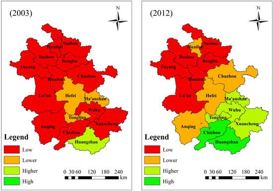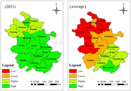 From 2003 to 2021, Anhui Province has exhibited an overall increasing trend in its water resources carrying capacity. The average regional water resources carrying capacity has transitioned from 0.34 in 2003 to 0.39 in 2012 and then to 0.49 in 2021, indicating a significant increase in water resources carrying capacity. The water resources carrying capacity of Anhui Province was between 0.3 and 0.4 from 2003 to 2013, with a slow growth rate. However, after 2013, the growth rate increased significantly, with the value exceeding 0.5 in 2020, followed by a decrease in 2021. The evolution of water resources carrying capacity in Anhui Province can be subdivided into three stages, namely 2003–2010, 2011–2016, and 2016–2020. The water resources carrying capacity in these three phases exhibits a cyclical pattern, with a significant decline followed by a steady increase in the subsequent years. To further explore the spatial pattern of water resources carrying capacity in Anhui Province, the researchers utilized ArcGIS10.8 software to visualize the water resources carrying capacity of 16 cities in the province. The natural breakpoint method was employed to classify the water resources carrying capacity of Anhui Province, and the resulting classification is presented in Figure 2. The annual average water resources carrying capacity of Huangshan, at 0.51, is the highest in Anhui Province. The cities of Ma’anshan, Wuhu, Wuhu, Chizhou, Tongling, and Xuancheng exhibit a high level of water resources carrying capacity, with an average range of 0.4–0.5. Conversely, the water resources carrying capacity of Hefei, Anqing, Chuzhou, Huainan, and Huabei is considered “poor,” indicating a low level of water resources carrying capacity. The cities of Suizhou, Bengbu, Bozhou, Liuan, and Fuyang exhibit the lowest level of water resources carrying capacity in the province. When considering the natural geographic characteristics and economic and social development level of each region, it is evident that southern Anhui, represented by Huangshan, receives ample precipitation, has dense rivers, and abundant surface water resources, resulting in superior natural conditions for water resources. Additionally, the population in southern Anhui is relatively small, and the industrial structure is reasonable, with fewer polluting industries, resulting in a high overall ecological carrying capacity of water resources. The central region of Anhui Province, represented by Hefei, is a leader in terms of both economy and environment. However, the large population in the region places significant pressure on local water resources, and the proportion of domestic and public water consumption is excessively high, resulting in an overall water resources carrying capacity that is only at a moderate level. In the northern region of Anhui, the climate is primarily temperate monsoon, with scarce precipitation and high population density. As a result, the region experiences periodic water resource shortages. Additionally, the cities in the north of Anhui retain a significant number of mining and chemical industries, which have seriously damaged the water ecology, resulting in a poor carrying capacity of water resources.