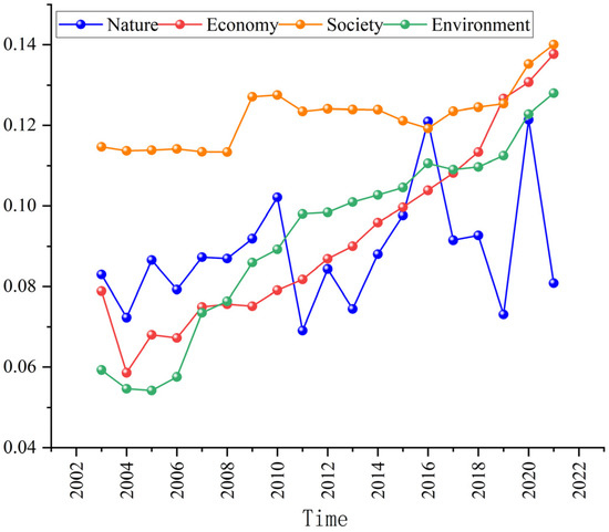 This study conducts an analysis of the subsystem layer of water resources carrying capacity in Anhui Province. Within the framework of water resources carrying capacity, the comprehensive indices of natural, economic, social, and environmental systems are visualized in Figure 3. It is observed that the social subsystem accounts for the largest proportion of the regional water resources carrying capacity, while the natural subsystem exhibits the largest change compared to the economic, social, and environmental subsystems. The natural subsystem is influenced by regional geographic and climatic factors, particularly precipitation. Notably, the score of the natural subsystem displays a “W”-shaped increase from 2003 to 2021. However, the oscillation of the water resources subsystem increases after 2011 and no apparent upward or downward trend is observed. From 2003 to 2021, the economic subsystem of Anhui Province has exhibited significant growth, with a notable acceleration in the past decade. Specifically, the growth rate of the water resources system from 2012 to 2021 is approximately three times that of the period from 2003 to 2011. This growth has been accompanied by a weakening dependence of primary and secondary industries on water resources, and a significant improvement in the water resources utilization efficiency of the economic system. In contrast, the social subsystem has remained relatively stable over the same period, with only two large increases observed in 2008–2009 and 2019–2020. Despite the gradual improvement of infrastructure and water conservation measures in Anhui Province, the pressure on water resources caused by the growth of population and population density has been constantly increasing. The environmental subsystem index has exhibited a steady increase from 2003 to 2021, indicating effective control of water environment pollution and significant improvement in the water ecological status during the process of economic and social development in Anhui Province.