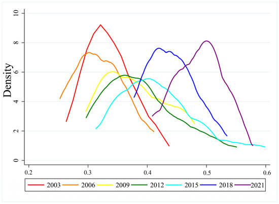 To determine whether there exists a spatial effect on the water resources carrying capacity of Anhui Province, the static kernel-density estimation of spatial conditions is employed to examine the convergence pattern of water resources carrying capacity enhancement in Anhui Province. The kernel-density estimation results are presented in Figure 6.