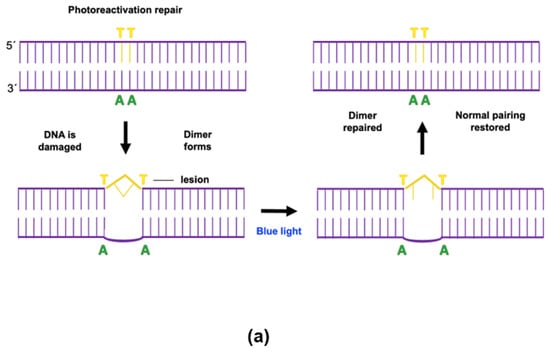 Representative diagram of the cell repair mechanism by (a) photoreactivation and (b) dark repair. Source: self-made based on Hijnen et al. [13].