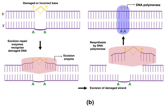 Dark repair or excision repair is based on the use of enzymes that replace damaged DNA with undamaged nucleotides. According to Goosen and Moolenaar [69], the proteins UvrA, UvrB, and UvrC participate in the repair process, which takes place in the following steps: