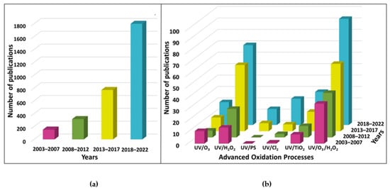 Similarly, a search was carried out to visualize the evolution of AOPs combined with UV. We proceeded in the same way as described above but added as criteria in the search strings of the most well-known AOPs, which include UV/ozone, UV/hydrogen peroxide, UV/PS, UV/chlorine, UV/titanium dioxide, and UV/ozone/hydrogen peroxide. As an example, for UV/ozone, the search fields were “wastewater treatment” and “UV” or “ultraviolet” and “ozone” or “O3” and scientific articles between the years 2003 and 2022 were selected.