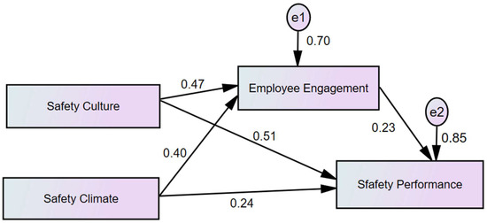 This study used the growth path model to explore how the studied variable affected mediation. It aggregated the detrimental effects of the direct, indirect, and mediating variables on the support, as evaluated using path modeling regression weight analysis. The structural equation model (SEM) accounted for the mediating effects of the outcome variable and balanced all the independent factors. The results of the mediating variable illustrated the combined, direct, and indirect impacts of the mediating variable on safety performance. The outcomes of the growth path modeling demonstrated that the mediation weights considered two perspectives. The first investigated the mediating effects of employee engagement and the consequences of each independent element. Employee engagement had a positive and statistically significant mediation impact on safety culture and safety climate at β = 0.468 and β = 0.402, respectively. This result implied that employee engagement significantly influenced safety culture and climate. The second aspect that required examination was how employee engagement affected safety performance. Employee engagement positively and significantly influenced safety performance, encouraging the total effects (β = 0.229). In conclusion, all the direct, indirect, and total effects measurements showed that the mediating impacts of employee engagement and all the independent determinants on safety performance were highly significant and constructive. Thus, as demonstrated in Table 5 below, the role of employee engagement was advantageous for manufacturing enterprises considering safety culture and safety climate.