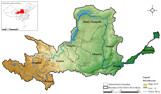 The Yellow River basin (95°59′–118°58′ E, 31°56′–42°03′ N) is an important ecological barrier and carbon storage area. The Yellow River basin extends from the Bayankara Mountains in the west, the Bohai Sea in the east, the Qinling Mountains in the south, and the Yin Mountains in the north. It passes through nine provinces in China and covers a total area of approximately 795,000 km2, accounting for approximately 8.3% of the total area of China (Figure 1). In 2020, the total population in the Yellow River basin was 170 million, accounting for 11.5% of the total population in China; the gross domestic product (GDP) reached CHY 1.1 × 105 billion, accounting for 10.5% of China’s GDP [37]. In recent years, with the development of populations and economies and the implementation of national policies, such as the construction of ecological civilization and the “dual carbon goals”, the ecological protection and high-quality development of the Yellow River basin have become important research topics.
