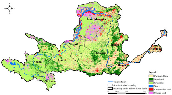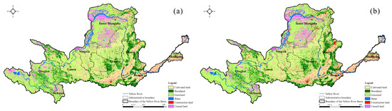 The changes in LULC in the Yellow River basin: (a) 2010 and (b) 2020.