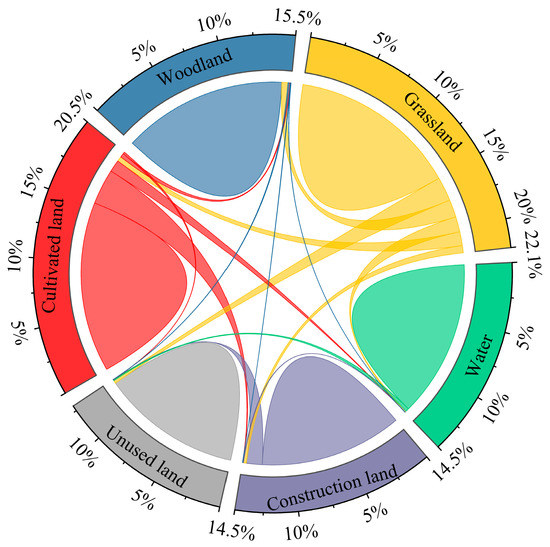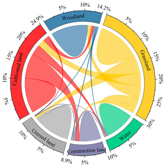 Figure 4 shows the Sankey diagram of the area change in LULC types in the Yellow River basin from 2010 to 2020. The intensity of transition in LULC types in the Yellow River basin from 2010 to 2020 was significant, with approximately 255.08 × 103 km2 of the area undergoing change. The transition of LULC types is mainly reflected in the net increase in construction land, grassland, water bodies, and woodland, as well as the net decrease in unused and cultivated land. Transitions from construction land were mainly to cultivated land, accounting for 1.07% of the total of the study area. However, the encroachment of construction land on cultivated land and grassland due to urban expansion resulted in a net increase in the overall area of construction land, which covered 1.77% and 0.60% of the total of the study area, respectively. Grasslands were mainly converted into cultivated land and woodland, accounting for 5.97% and 3.10% of the total of the study area, respectively. At the same time, 6.18% and 3.04% of the total of the study area were converted from cultivated and woodland areas to grassland, respectively, resulting in a relative balance between grassland and cultivated and woodland areas in terms of occupation and compensation. The net increase in water bodies was mainly due to the conversion of cultivated land, grassland, and unused land, which accounted for 0.37%, 0.36%, and 0.12% of the total of the study area, respectively. The woodland area continued to increase, mainly from cultivated land and grassland, but the increase was smaller-scale, mainly due to the “Three-North Shelter Forestation Project” and the “Grain for Green” project. The cultivated land area decreased more significantly, changing mainly to woodland, construction land, and grassland, accounting for 6.18%, 1.77%, and 1.28% of the total of the study area, respectively. This is related to the expansion of urban construction, the “Three-North Shelter Forestation Project”, and the implementation of “Grain for Green”, as mentioned above. Unused land was effectively exploited during the decade, with varying degrees of conversion to other land types.