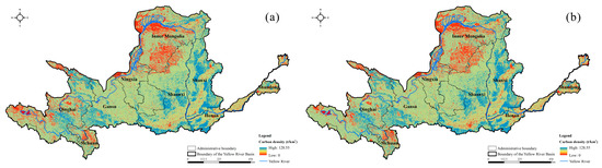 Spatial pattern of carbon storage in the Yellow River basin: (a) 2010 and (b) 2020.