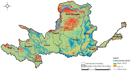 Carbon density is an important input parameter for the InVEST model to accurately assess carbon storage. In this study, carbon density data for different land types were obtained based on the “2010s Chinese terrestrial ecosystem carbon density dataset” [41] and the nationwide carbon density studies by Chen et al. [42] and Yang et al. [43] and modified using relevant literature on the Yellow River basin.