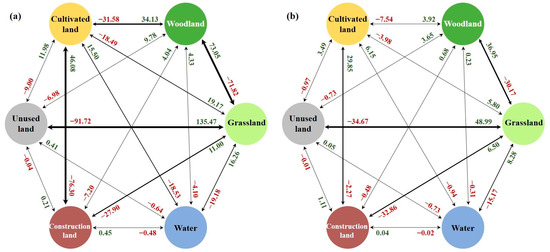 Our results found that changes in carbon storage and spatial patterns in the Yellow River basin were highly correlated with land use change and spatial distribution, and other research studies have also identified land use change as one of the most important factors contributing to global changes in terrestrial ecosystems’ carbon storage [46,47,48]. To further analyze the variability of the effects of differences in the land transfer area, soil, and vegetation carbon density on carbon storage among different land use types, this study calculated the corresponding carbon storage transition matrix based on the area transfer among land use types (Figure 9).