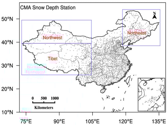 As an important physical quantity in the Earth system, snow, with its high albedo and low thermal-conductivity properties, affects the surface energy balance and thus has an impact on the regional and global weather and climate [1,2,3]. The accumulation and melting of snow also affect the water cycle; the reduction in seasonal snow in particular has a certain impact on the development of agriculture and livestock, crop growth, and natural ecology in arid and semi-arid areas [4,5,6]. Furthermore, the reduction in permanent snow is an indicator of global warming, warning people to take action as soon as possible to mitigate climate change from a sustainable development perspective [7,8]. And in the context of global warming and the increase in extreme weather and climate events, the frequency of blizzards has increased, and the accurate monitoring of snow depth can contribute to improving the level of early warning and prevention of snowstorms [5,9,10]. At present, the snow depth is mainly determined through station observations, satellite remote sensing, and model simulations. There are more than 2400 operational snow-depth sites observed by the China Meteorological Administration (CMA), which are divided into manual and automatic station observations. The site observations can better indicate the snow depth of the location, but the spatial representation is poor [11]. Satellite remote sensing can better capture the distribution of snow than snow-depth station observations; for example, the Moderate-Resolution Imaging Spectroradiometer (MODIS) has the advantages of high spectral resolution and wide spatial coverage, and it produces a global daily snow cover product [12]. But the satellite remote sensing has poor penetration ability for snow depth and is influenced by the inversion algorithm used, the vegetation coverage, and clouds [12,13,14]. For example, although the Feng Yun 4 satellite snow data has a high spatial and temporal resolution, the snow information can only be reflected in non-cloudy areas during the daytime. Therefore, the land-surface model with physical processes, dynamics, and thermodynamics that best approximate the accumulation–melting of snow is a possible way to determine the snow depth in a spatiotemporal continuum [15,16,17,18].
