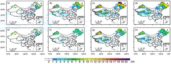 The spatial distribution of snow depths for the CMA observations (a,e), CLM3.5 (b,f), Noah (c,g), and Noah-MP (d,h) in the snow-accumulation period (a–d) and the snowmelt period (e–h).