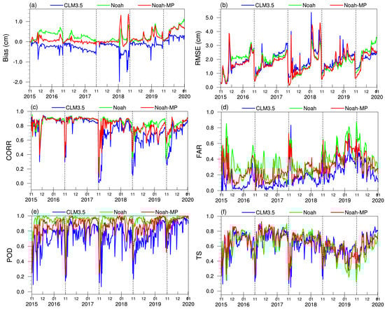 Time series of snow-depth errors simulated using the CLM3.5, Noah, and Noah-MP models during the snow-accumulation period ((a) bias, (b) RMSE, (c) CORR, (d) FAR, (e) POD, (f) TS).
