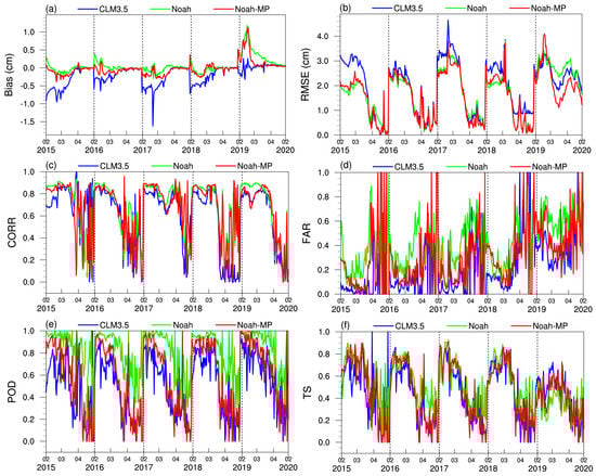 The time series of the snow-depth errors simulated by the CLM3.5, Noah, and Noah-MP models during the snowmelt period ((a) bias, (b) RMSE, (c) CORR, (d) FAR, (e) POD, (f) TS).