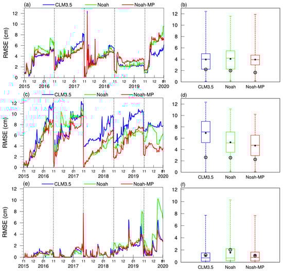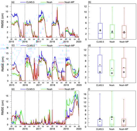 The RMSE time series and their statistical values for Northeast China, Northwest China, and the Tibetan Plateau in the snowmelt periods are given in Figure 6. Firstly, it can be seen that the RMSE of the three models showed a gradually decreasing trend, with April being lower than March and March being lower than February, which was related to the gradual melting of snow in Northeast China (Figure 6a,b). The average RMSE was 3.43 cm, the median was 2.2 cm, and the standard deviation was 3.28 cm for CLM3.5. The average RMSE was 3.02 cm, the median was 2.18 cm, and the standard deviation was 2.62 cm for Noah, while the average was 2.9 cm, the median was 2.58 cm, and the standard deviation was 2.45 cm for Noah-MP. In comparison, the snow depth of Noah-MP was the best, followed by that of the Noah model and then CLM3.5.
