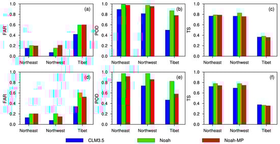From the performance of the different models during the snowmelt periods (Figure 7d–f), Noah had the largest FAR in both Northeast China and Northwest China, but its POD and TS were best in those regions, and the FAR (POD and TS) of Noah-MP (CLM3.5) was greater than that of CLM3.5 (Noah-MP) in both Northeast China and Northwest China. For the Tibetan Plateau, the FAR and POD of the three models indicated that Noah had the highest POD and the largest FAR, and the FAR of Noah-MP was higher than that of CLM3.5, while its POD was better than that of CLM3.5. The TS of CLM3.5 (0.376) was better than that of Noah (0.366) and Noah-MP (0.354).