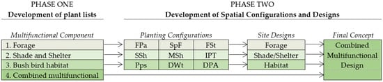 Outline of research methodology: “Phase One”, the development of the plant lists focusing on three components of a multifunctional dryland agricultural landscape, which are then applied to “Phase Two”, the development of spatial configurations and designs. Key: FPa: Forage patches; SpF: Spreading forage; FSt: Forage strips; SSh: Straight shelter; MSh: Meandering shelter; IPT: In-paddock shade trees; Pps: Area of bush bird habitat focused on existing poplar trees; DWt: Area of bush bird habitat focused on existing drainage/wetland corridor; and DPA: A densely planted area of the bush bird habitat.