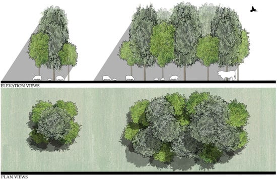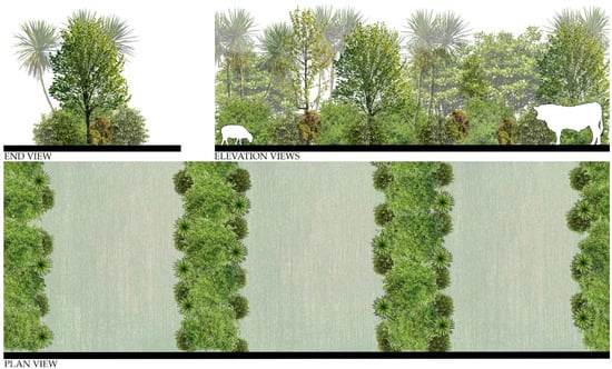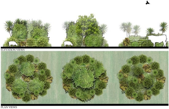 The spreading forage configuration balances access to forage and prevents overbrowsing. Taller forage species are fenced off, with shade-tolerant species underneath and sun-tolerant species spreading into adjacent paddocks. This design allows controlled access to forage by moving livestock between paddocks, allowing plants to regrow. The configuration provides a more natural form for livestock, improving welfare with shade and shelter throughout the day and under different weather conditions. The fenced areas protect new seedlings, allowing for natural regeneration. Plantings replicate natural variations, enabling livestock to exhibit natural foraging behaviors (see Figure 5).